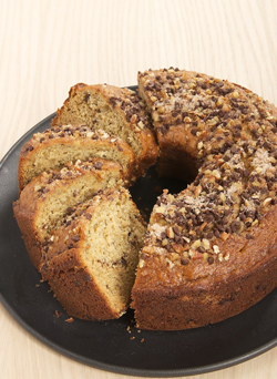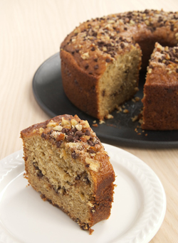 The cake was all I wanted it to be and more. It’s less dense and more delicate than most coffee cakes I’ve made. The banana flavor is subtle but works so well with that gorgeous ribbon of chocolate, nuts, and cinnamon.